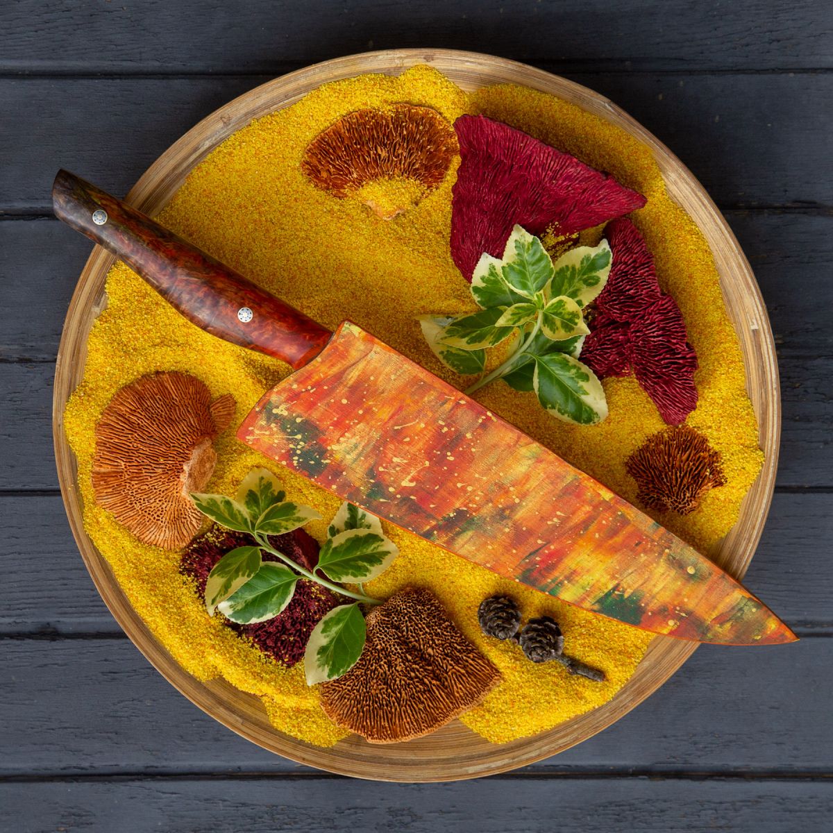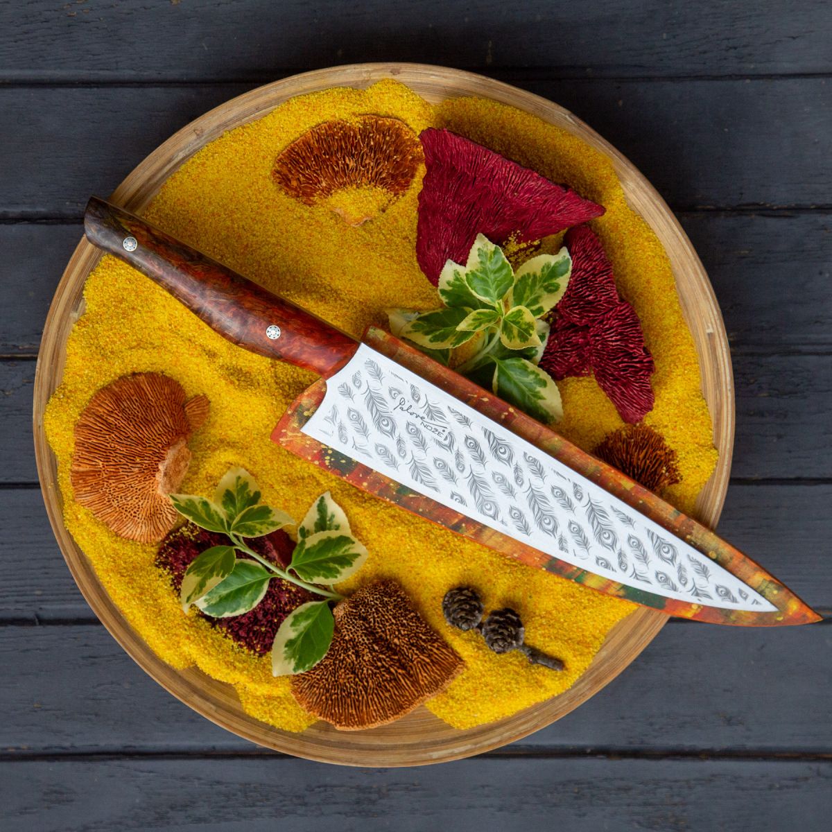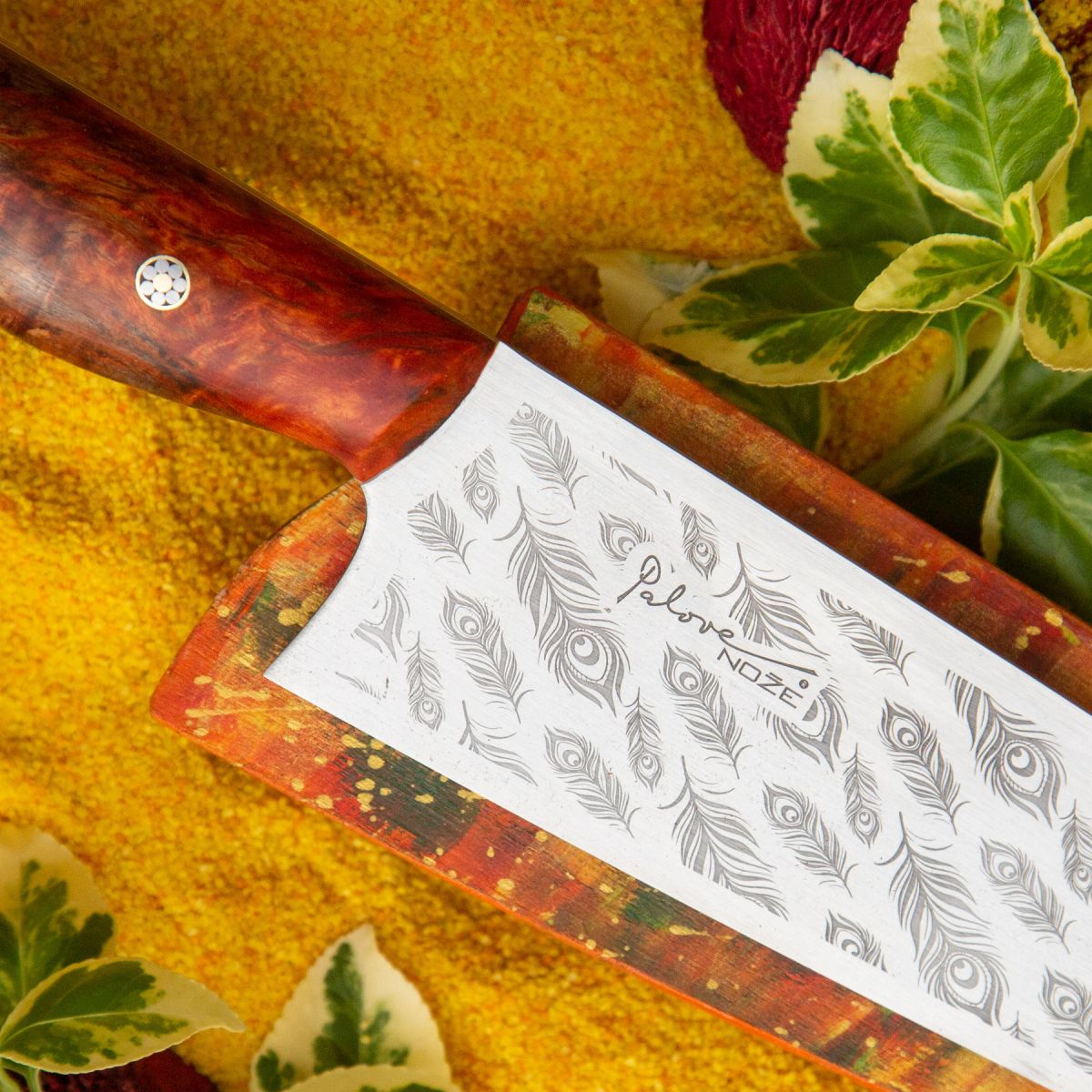 veľmi praktický a úplne dokonalý kuchynský nôž západného typu... každý veľký výrobca má niečo podobné v ponuke, ale žiadny nie je krajší:) ľahučký a elegantný univerzál do kuchyne... s nádhernou sayou (púzdro od mojej manželky)... gravir vieme ešte doplniť podľa požiadaviek zákazníka...